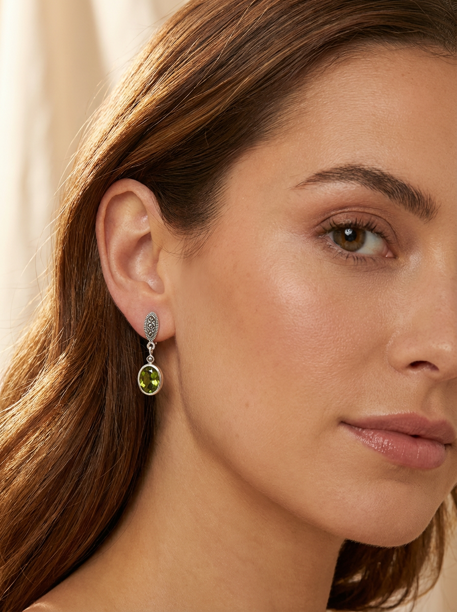 Add a touch of refined colour with these 925 sterling silver drop earrings set with shimmering marcasite and vibrant CZ simulated diamonds. Each earring features an elongated marcasite-studded top and a bezel-set oval green CZ stone that catches the light with every move.