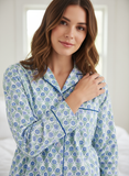 Elegant Long Sleeve Button-Down Design: The button-up pajamas for women are stylishly designed with white piping, adding a refined, timeless look perfect for lounging or sleeping.